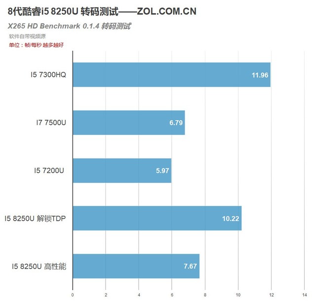 X265 HD Benchmark 的結(jié)果介于兩者之間,i5 8250U 表現(xiàn)較好。