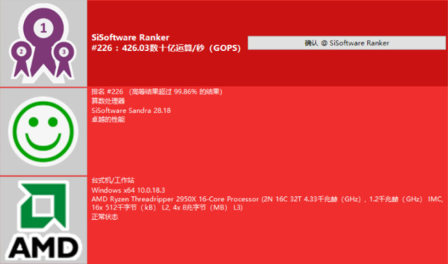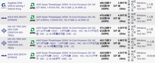 通過測試,在這套平臺上面,我用2950X跑出了426.03 GOPS的成績,通過讀取細節我們發現,產品全核運行在4.33GHz之下,也并沒有達到最佳的4.4GHz,而目前全球關于這款產品的測試也有一些結果可參考,但是很奇怪的是其他成績甚至在3.98GHz狀態下所得到的成績都比我的426.03 GOPS的成績更具競爭力。最高的一組甚至達到了486.5 GOPS,顯然我所跑出的數據還是相對比較保守的。