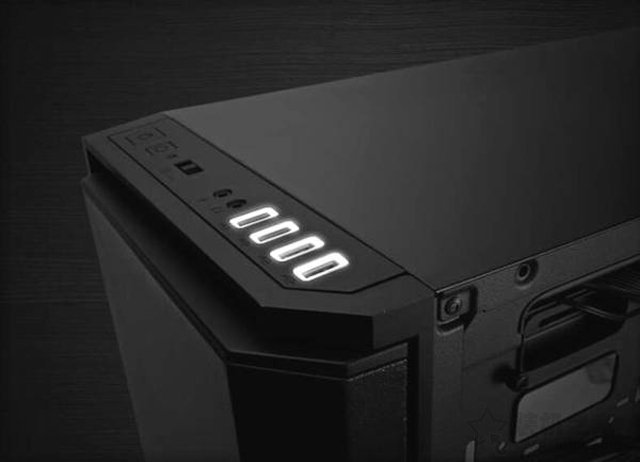 機箱頂部I/O面板,配備了4個USB接口,分別為2個USB3.0和2個USB 2.0,還有3.5mm耳麥插孔和開機按鍵等,在USB接口處還設置了背光,在夜間光線微弱的情況下,在插USB設備的時候更加方便,貼心。