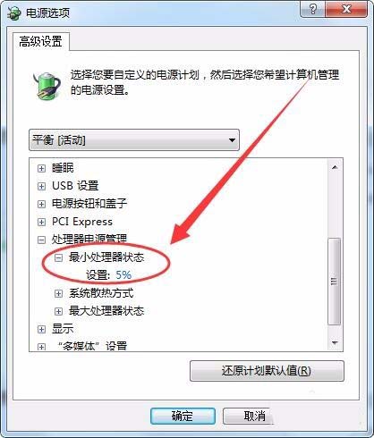 6、最小處理器狀態(tài)選項(xiàng)處,可以設(shè)置處理器的最小使用百分比。