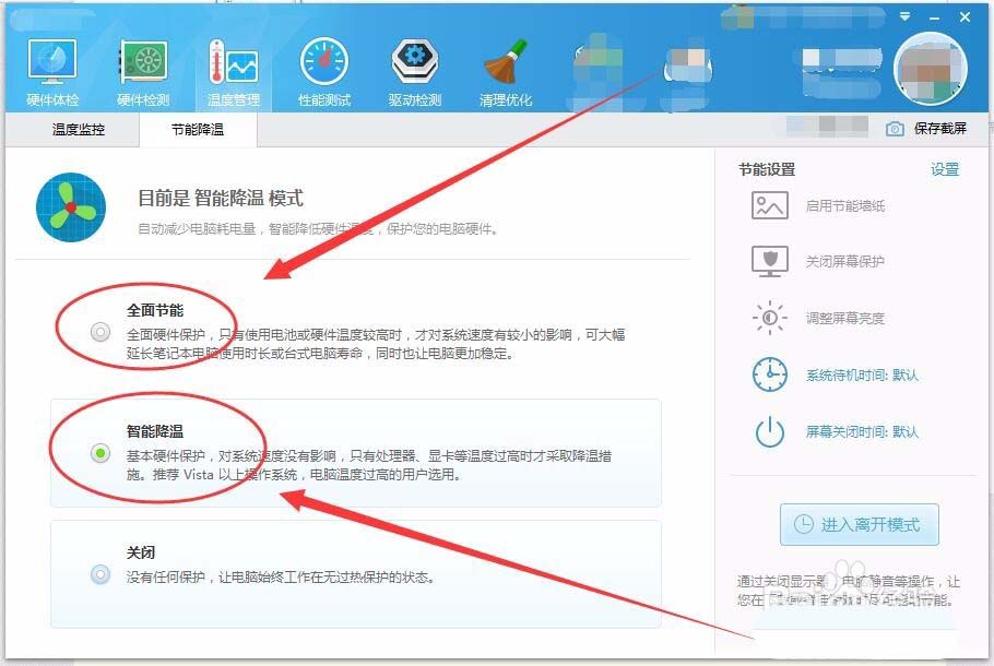3、節(jié)能降溫窗口中,可以選擇智能降溫或全面節(jié)能選項(xiàng)。