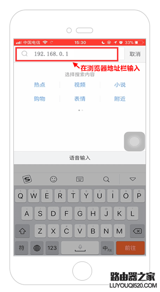 在路由器底部貼紙上查看路由器登錄IP地址,然后在電腦或手機上打開瀏覽器,在地址欄輸入192.168.0.1登錄管理頁面。