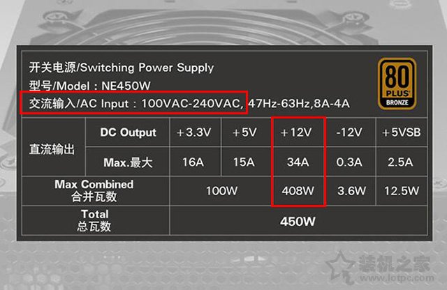 通過電源銘牌能夠看出來,交流輸入電壓為100V-240V,也就是我們所謂的“寬幅電源”,你家里的電壓需要在這個范圍內才可以使用,國內家庭用的電壓都是220V,國外也會有110V的。在參數中,,所以我們可以作為功率選擇的標準,其他的+3.3V、+5V之類的都是耗電非常少的硬件,所以基本不用考慮,平時也肯定足夠使用的。