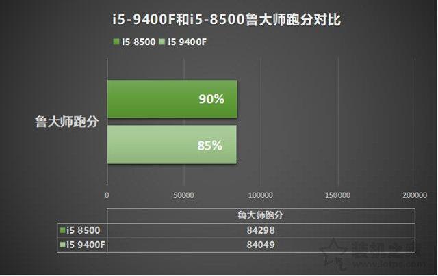 魯大師跑分結果,i5-9400F跑了84049分,而i5-8500跑了84298分,兩者差了200分左右,i5-8500小勝,不過差距極小,完全可以忽略不計。