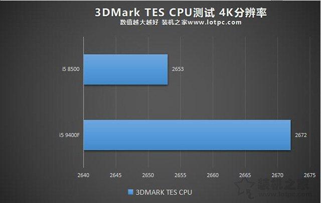 3DMARK TES CPU測試,4K分辨率下,i5-9400F跑分2672,i5-8500跑分2653,i5-9400F小勝,性能提升也是可以忽略不計的。
