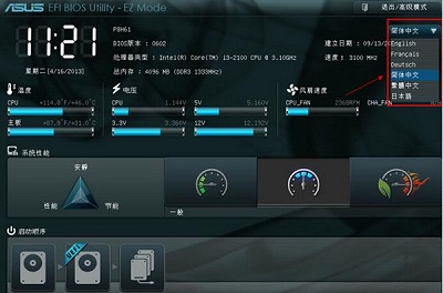 2、打開華碩uefi bios界面后,移動鼠標至右上角將顯示語言設置為“簡體中文”,如下圖所示: