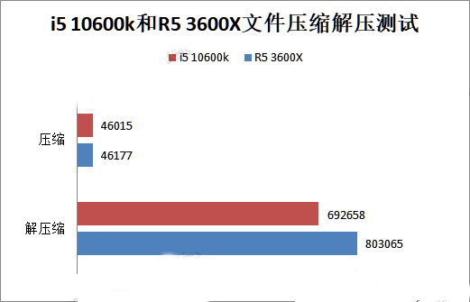 在7-zip測試項(xiàng)目里,i5-10600K在壓縮測試?yán)锩嫘阅芎蚏5 3600X差不多,但解壓縮測試中R5 3600X的表現(xiàn)比i5-10600k要好很多。