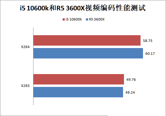 x264的測試中i5-10600K稍落后于R5 3600X,x265測試中就反了過來,總體來說,在該測試項(xiàng)目里,i5 10600k和R5 3600X的性能表現(xiàn)差不多。