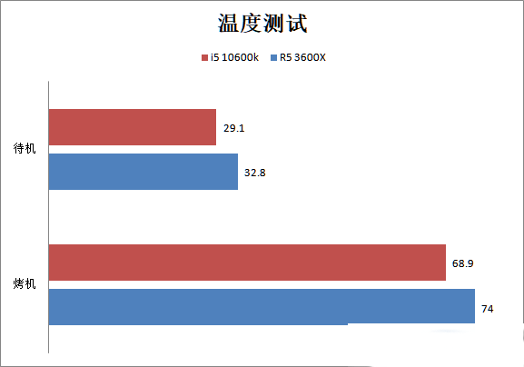 雖然i5 10600k的設(shè)計(jì)功耗是125W,要比R5 3600X的95W更高。不過在溫度方面的表現(xiàn)i5-10600k反而更好,待機(jī)和烤機(jī)時(shí)的溫度都要比R5 3600X更低,烤機(jī)不到70度的溫度還是非常涼爽的。