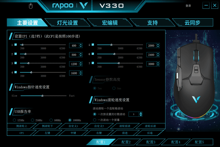 通過鼠標頂部的DPI切換按鍵,可以實現7檔DPI快速切換,滿足日常辦公、不同游戲的移動需求。在配套的驅動中,可以修改每個檔位的DPI值,定制成自己常用的DPI值,更符合自己的需求。除此之外,還可以調節USB報告率、指針速度、滾輪速度等。