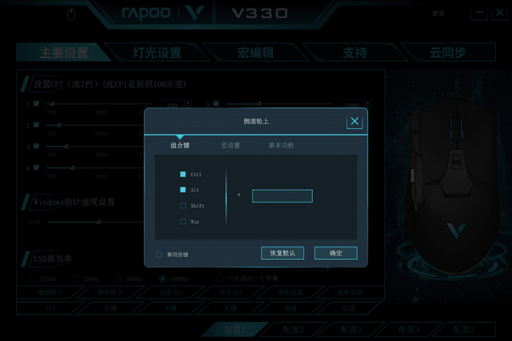 配套驅動支持5組配置文件,可以保存不同的配置組合,驅動軟件的設置還可以同步到云端,使用不同設備也能快速調用。修改的配置可以存儲在鼠標上,設置完成關閉驅動軟件同樣保留效果,使用更加方便。