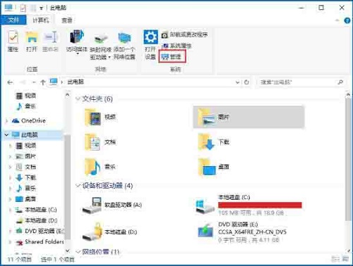2、點(diǎn)擊中間的管理選項(xiàng),或者直接選中此電腦,然后點(diǎn)擊鼠標(biāo)右鍵,也會(huì)出現(xiàn)管理選項(xiàng);如圖所示: