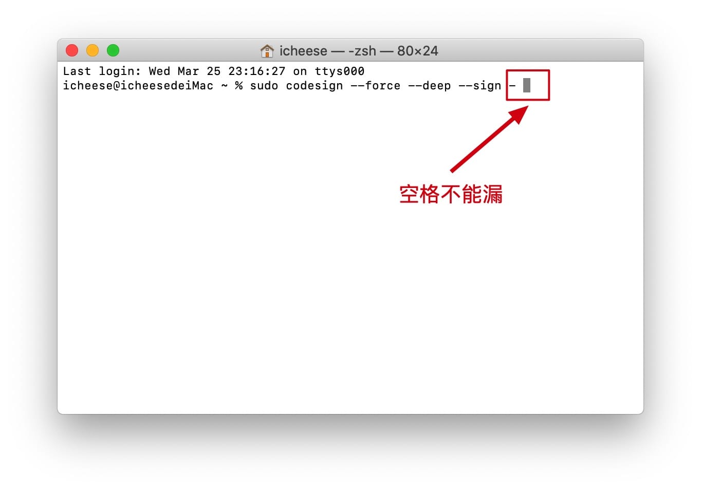 打開終端工具輸入并執行如下命令:sudo codesign --force --deep --sign - (應用路徑)