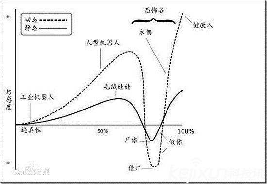 這段不能被認同的領域被稱作恐怖峽谷,針對這一現象,日本機器人專家森昌弘提出一個關于人類對機器人和其他物體感覺的假設理論,叫做“恐怖谷理論”。他認為,人形玩具或機器人的仿真度越高人們越有好感,但當達到一個臨界點時,這種好感度會突然降低,越像人越反感恐懼,直至谷底,稱之為恐怖谷。