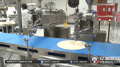 三藩市一家比薩餅餐廳Zume,與瑞士機器人制造商ABB合作設計了一款比薩機器人,整個系統恰似一條完整的比薩生產線,雖然仍需要人工放置面餅和配菜,但可以實現涂抹醬料、烘烤等工序,極大減少了人工需求。