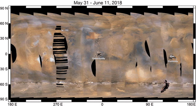 由于沙塵暴擋住了陽光,導致機遇號無法為電池充電,機遇號從今年6月起便失聯至今。這張動圖顯示,機遇號正好位于沙塵暴的前進路線上。