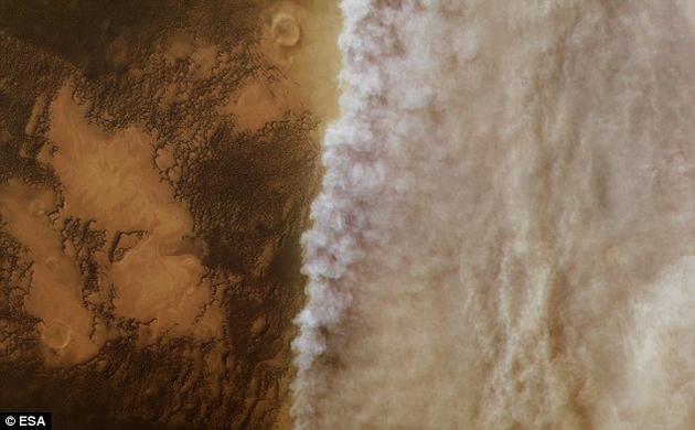 這張照片由歐空局“火星快車號”探測器拍攝。從圖片右側可以看出,這場沙塵暴是多么聲勢浩大。