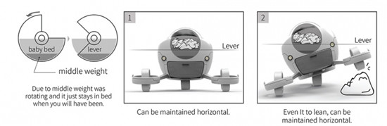 而且 Strollever 嬰兒車還有類似攝像頭云臺的功能,無論地面多么坑坑洼洼,Strollever 車內的嬰兒小床仍然保持水平,絲毫不會影響到寶寶的睡眠。