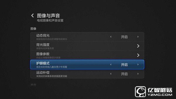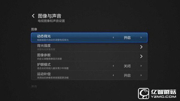 動態背光根據畫面內容動態調整電視背光。簡單說,就是對電視畫面中比較暗的部分調低背光亮度。這樣在基本不影響畫面的情況下部分調低了背光,節約用電。首先進入“小米電視設置”,選擇“圖像與聲音” ,選擇“ 動態背光調節 ”,然后點擊開啟。