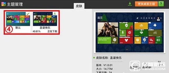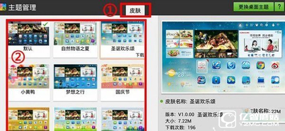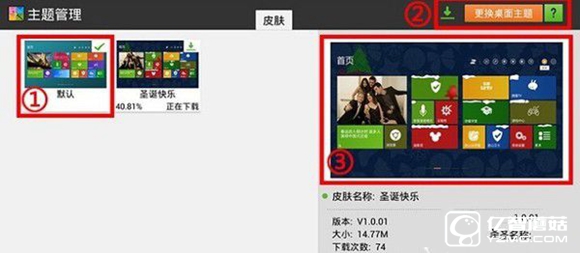 進入主題管理主界面,① 勾選選項為當前使用主題皮膚 ②右上角按鈕可進入更換桌面主題 ③當前選中主題預覽效果。