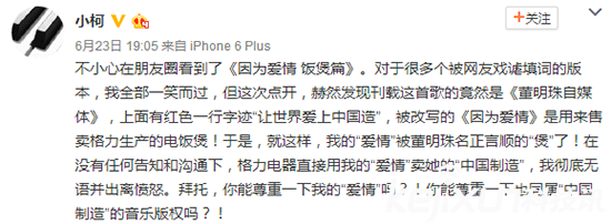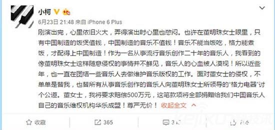 小柯在自己的微博中表示這是董明珠在用他的愛情在賣她的中國造,小柯表示不能接受這種事情,不能接受一個在宣傳中國造的人不尊重中國造的音樂版權,所以小柯在后面聲稱,要求董明珠賠償500萬為中國的音樂版權保護事業做貢獻。