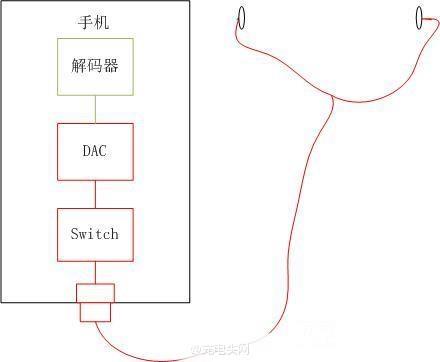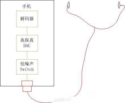 圖2為CDLA TYPE-C耳機的音頻傳輸通道,由于DAC放在了外置的USB插頭上,因此不再需要內部的Switch,音質損耗只存在于耳機線上。當然,這個是簡易的示意圖,實際上,從解碼器到DAC之間,是以USB2.0的格式傳輸的,但是這部分屬于純數字傳輸,是100%保真,可以無視。