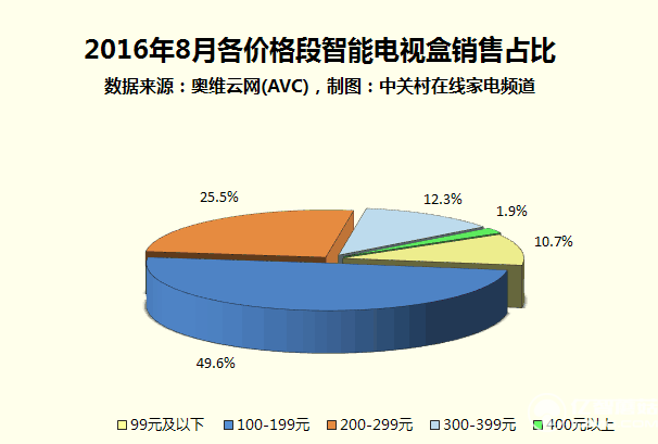 目前市場中的智能電視盒價格段跨度很大,從百元左右低價位產品到千元以上的機型都有覆蓋。究竟哪一價格段的智能電視盒最受消費者青睞呢?我們還是讓大數據來揭曉答案。根據大數據顯示,99元以下價格段的智能電視盒,銷量占比為10.7%,100-199元價格段智能電視盒,銷量占比為49.6%,200-299元價格段智能電視盒,銷量占比為25.5%。300-399元價格段智能電視盒,銷量占比為12.3%。400-499元智能電視盒,銷量占比為1.4%。500-599元價格段智能電視盒,銷量占比為0.1%。600-699元價格段智能電視盒,銷量占比為0.3%。800元以上價格段智能電視盒,銷量占比為0.1%。