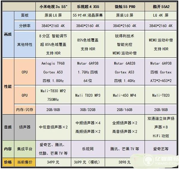 對(duì)于互聯(lián)網(wǎng)電視而言,評(píng)價(jià)標(biāo)準(zhǔn)不外乎是畫質(zhì)、硬件性能、音質(zhì)以及系統(tǒng)內(nèi)容等幾個(gè)方面。小編選取了樂(lè)視、微鯨和酷開這三個(gè)品牌的55英寸平板電視的最新產(chǎn)品,并將它們與小米電視3s 55英寸做個(gè)簡(jiǎn)要的對(duì)比介紹。可以看到,也許在某一方面小米電視3s 55英寸的表現(xiàn)并不是最好的,但就綜合實(shí)力而言,小米電視3s 55英寸還是那款最值得買的。