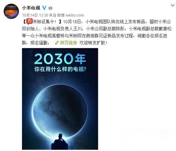 最近,小米電視官方微博透露將在10月18日首發一款新品,提出“2030年,你在用什么樣的電視”,暗示這款新品設計超前,功能設計要遠遠領先...