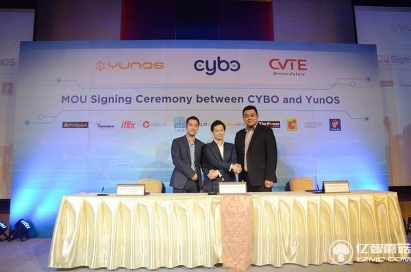 YunOS運營部總經理肖睿哲、Cybo總經理Sittikorn Chitpedakorn、CVTE COO王洋出席發布會并在現場進行MOU簽約儀式