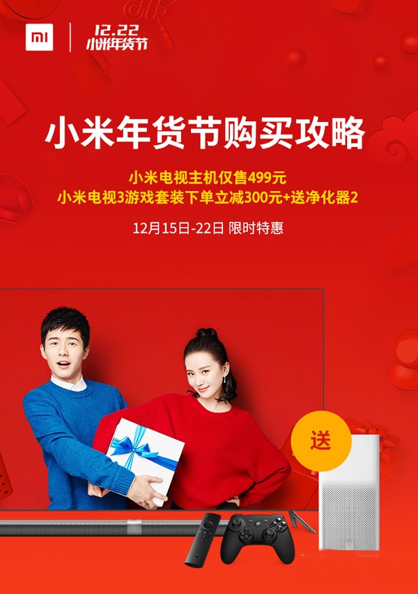 小米2016年貨節今日正式開啟。12月15日零點(即12月14日23點59分)-2016年12月22日23點59分為止,小米將用一周的時間為大家準備好2017年的科技潮貨過新年。手機、電視各自精彩,但電視與眾不同的地方在于,當全行業全面漲價、很多廠家普漲300元的今天,小米在電視產品上仍然堅持“厚道價格”不遺余力地回饋米粉。不僅有電視主機半價搶、立減300元的優惠活動,更有減了300還送凈化器2等超大力度的讓利行為。小米電視為米粉準備的科技年貨禮品,可謂誠意滿滿。
