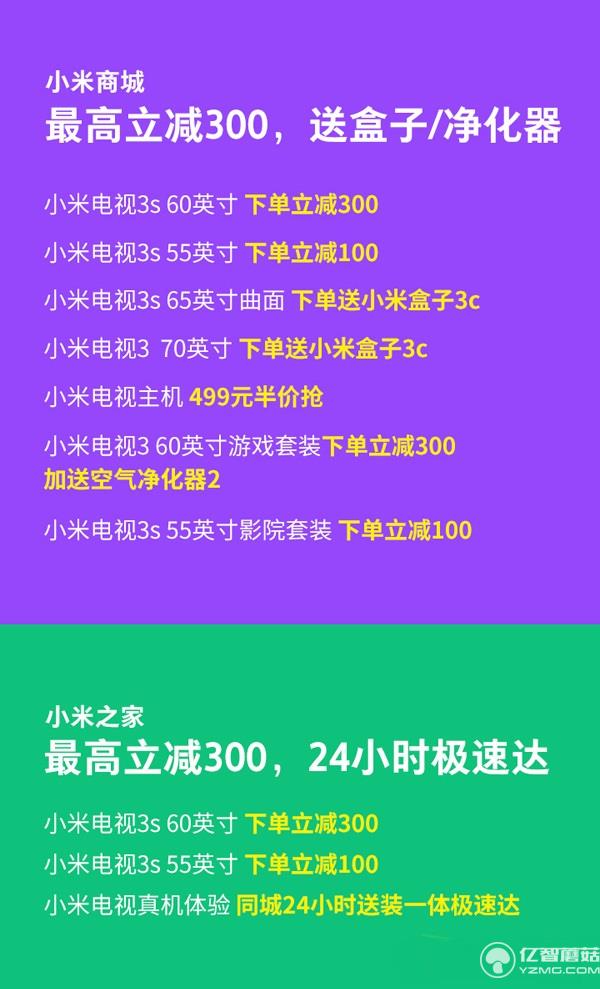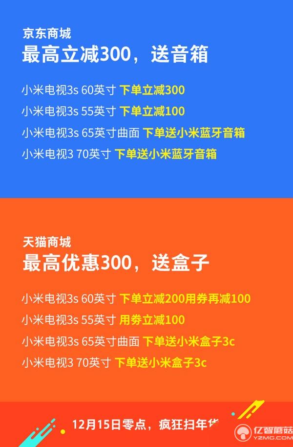 第二重優惠:在小米商城、小米之家、京東商城下單小米電視3s 55英寸立減100元,天貓商城下單則領券減100元;在小米商城、小米之家、京東商城下單小米電視3s 60英寸立減300元,天貓商城下單立減200元、領券再減100元。