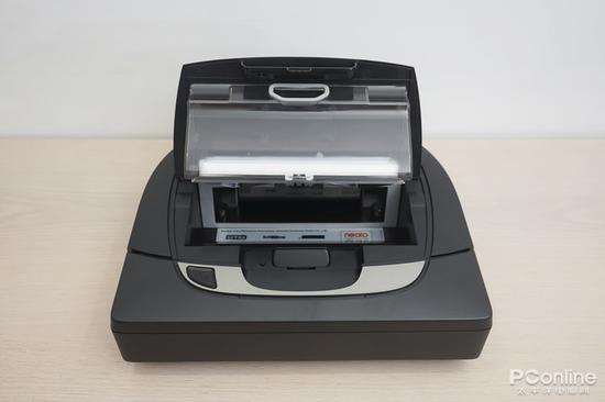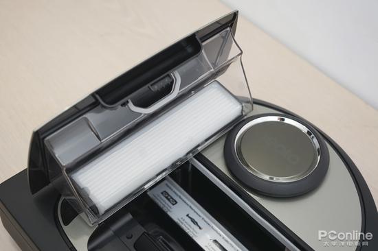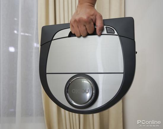 頂部只有一個按鈕,兼具了電源、啟動和對接的功能。頭部有一個凹槽,是揭開集塵盒的入口,同時還有一個非常人性化的功能,可以作為手提的把手。掃地機再也不用“抱著”了,可以很輕松的單手拎起來,非常巧妙便利的設計。