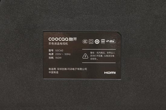 酷開6C的銘牌位于機(jī)身背面的中心位置,銘牌上面有這款電視的具體型號(hào),以及電源和功耗信息等。