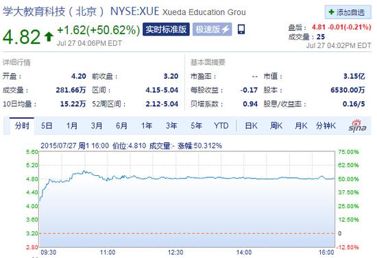 7月28日凌晨消息,學大教育周一收盤股價暴漲50.62%,股價升至4.82美元。中國股市大幅下跌,令美股承壓,其他中概股全線暴跌。...