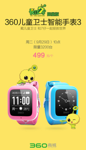 兒童智能手表360兒童衛(wèi)士進(jìn)軍娛樂圈,宣布與電影《長江7號超萌特攻隊》達(dá)成戰(zhàn)略合作,推出360兒童衛(wèi)士智能手表3長江7號限量版,全球僅有3200臺,售價499元,將于9月29日上午10點整,在360商城(mall.360.com)限量搶購。
