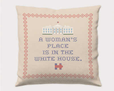 希拉里店里的東西,從背包到iPhone殼,無一不制作精美。每一件的設(shè)計(jì)都很討喜,印在商品上的競選語也都輕度幽默,標(biāo)價55美元的抱枕,上面寫著“女人的位置在白宮里”。
