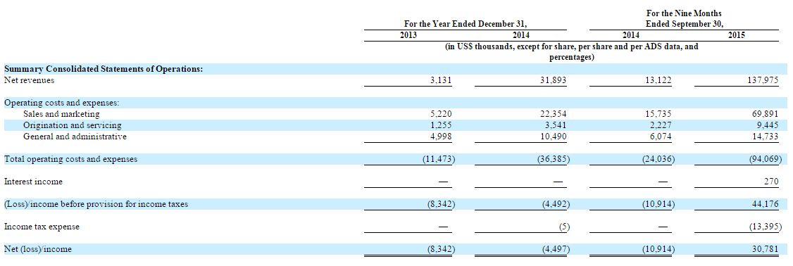在宜人貸上份IPO申請書中,披露了公司今年前6個月的財務數據,公司凈營收為7900萬美元,凈利潤為1730萬美元。在最新的申請書中,宜人貸前9個月凈營收為1.38億美元,并實現凈利潤為3078萬美元。而在2014年,該公司前三季度凈營收只有1312萬美元,凈虧損達1091萬美元。