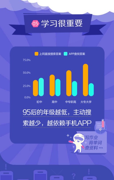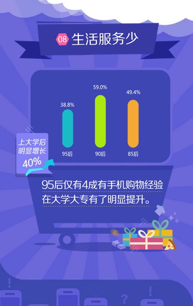 95后,即1995-1999年出生、年齡16-20歲、處于青春期末期的人群,人口總量約1億,在人口中占比不到10%,卻是移動互聯網用戶中占比最高的人群,他們是移動互聯網的原住民,移動搜索的主力用戶。隨著年齡增長95后正在迅速崛起,是未來幾年移動消費的主力用戶群體。