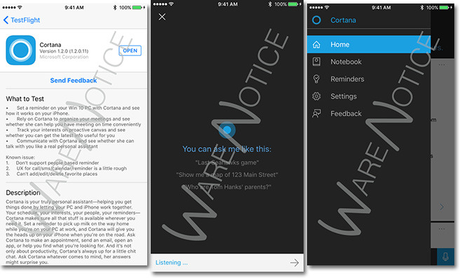 iOS版Cortana使用戶能通過語音交互方式創(chuàng)建提醒事項(xiàng)、安排約會、進(jìn)行互聯(lián)網(wǎng)搜索、編輯電子郵件和消息等。與Siri一樣,Cortana接受自然語言輸入,TestFlight邀請?zhí)嵝延脩?ldquo;注意她能否像一個(gè)真正的個(gè)人助手那樣與你交談”。