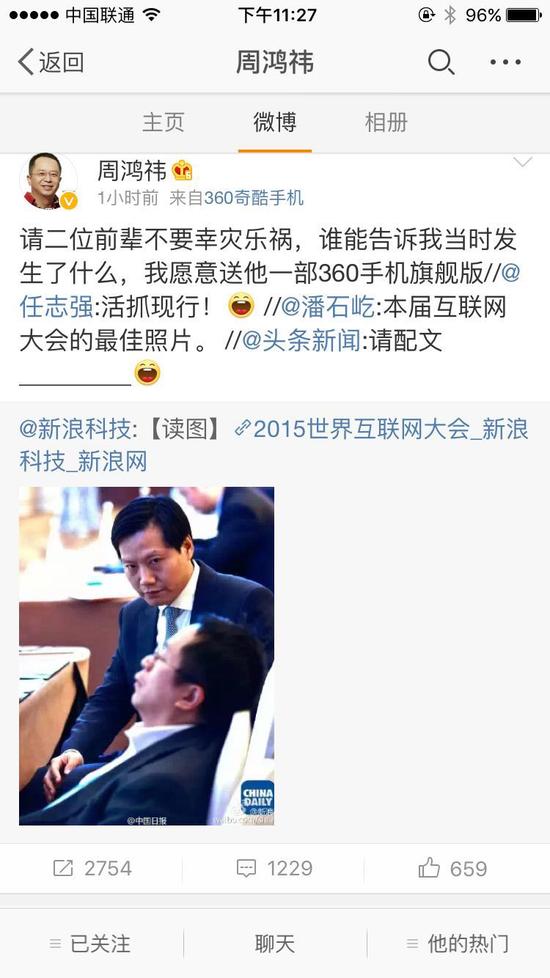 360CEO周鴻祎在論壇茶歇期間閉目養神,小米創始人雷軍頗含深意的一瞥被攝影記者拍下,并在昨日晚間引發了網友大面積刷屏、P圖。昨晚,周鴻祎睡醒發文調侃“在我熟睡中,到底發生了什么?”
