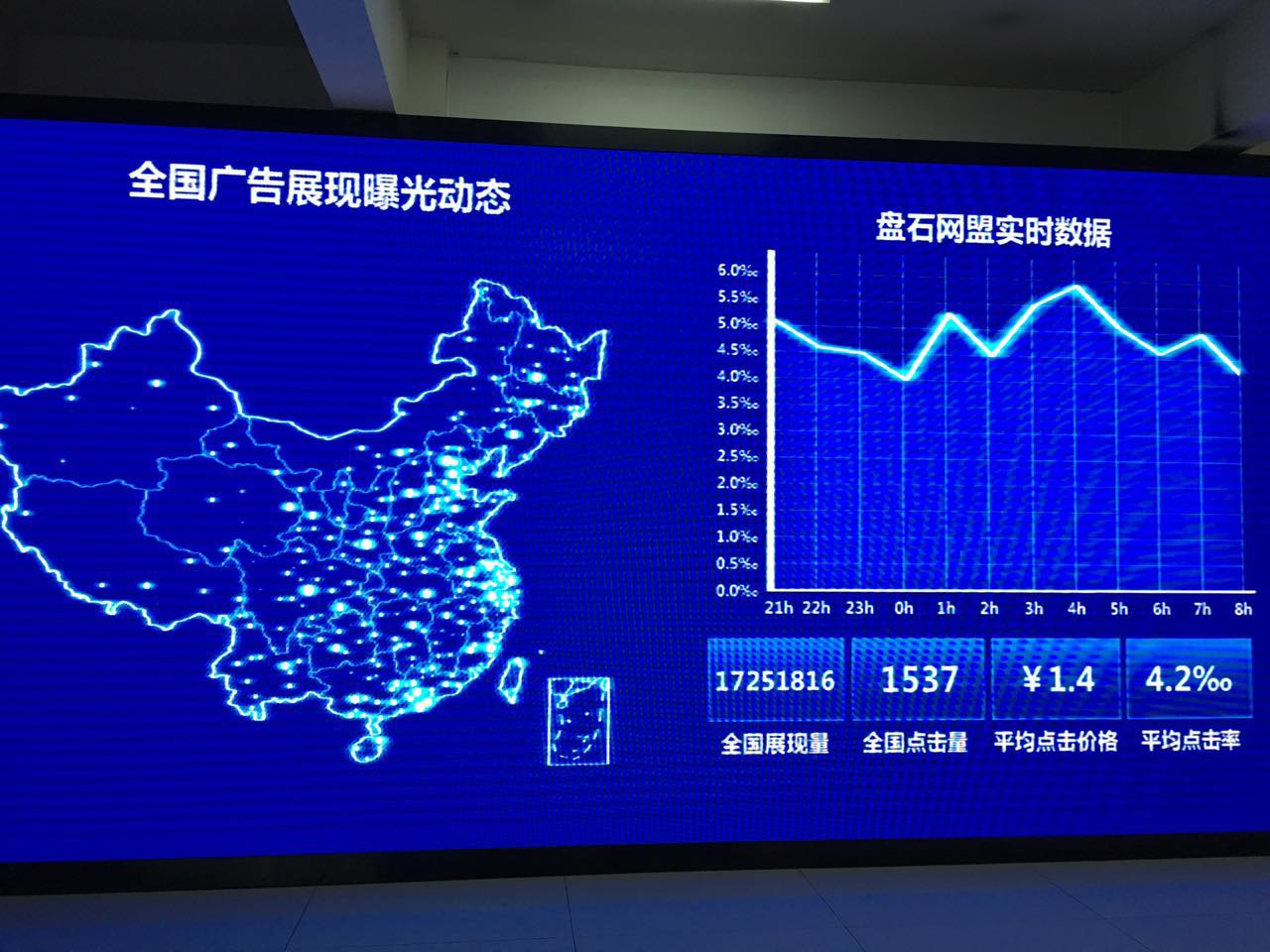 12月19日,記者應邀來到盤石總部,看到盤石全國廣告展現曝光動態大屏:盤石網盟實時數據量每天3個T,12月19日,14時47分,全國廣告展現量17251816次,全國點擊量1537,平均點擊價格1.4元,平均點擊率千分之四點二。