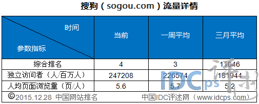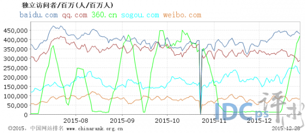IDC評述網(idcps.com)12月31日報道:根據中國互聯網協會-中國網站排名公布的最新數據顯示,截至2015年12月28日,國內網站獨立訪問量五強排名依次是百度、360安全中心、騰訊網、搜狗、微博。具體情況如下圖所示: