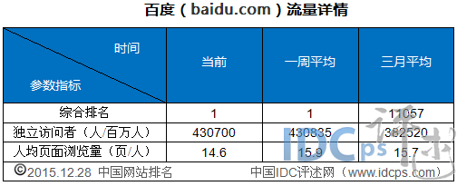 百度是全球最大的中文搜索引擎,2000年1月由李彥宏、徐勇兩人創立于北京中關村。截止2015年12月28日,在百度綜合排名中,當前與一周平均一致,均為第1。其當前獨立訪問者為430700個,與一周平均相差無幾。而當前人均頁面瀏覽量14.6頁,小于一周平均、三月平均。