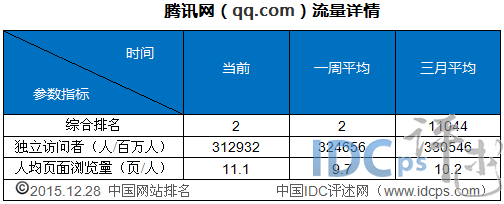 騰訊網目前是國內最大的門戶網站。由上圖可知,騰訊網當前各項數據情況分別是:綜合排名第2,獨立訪問者312932人,人均頁面瀏覽量11.1頁。值得注意的是,三月平均綜合排名為11044個,與當前、一周平均相比,遠遠落后。