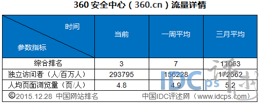 360安全中心是國內最大的免費安全平臺,以反惡意程序為主,提供安全上網工具、防病毒軟件下載和技術交流。觀察【當前】【一周平均】各項數據,可獲悉:當前綜合排名第3,較一周平均上升4位;獨立訪問者當前有293795個,相比一周平均的156228人,明顯增大;而在人均頁面瀏覽量中,當前略低于一周平均,為4.8頁。