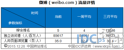 新浪微博是極具影響力的微博,通過140字記錄,“織圍脖”是網友隨時隨地記錄生活、分享社會新鮮事的生活方式。截止2015年12月28日,微博綜合排名當前第5,相比一周平均下降1位。而在獨立訪問者與人均頁面瀏覽量中,當前數值均最大,分別是85617人、35.0頁。