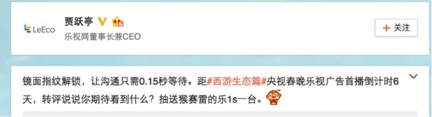 而2016年2月1號,樂視創始人賈躍亭發布一則微博:“鏡面指紋解鎖,讓溝通只需0.15秒等待。距#西游生態篇#央視春晚樂視廣告首播倒計時6天。”