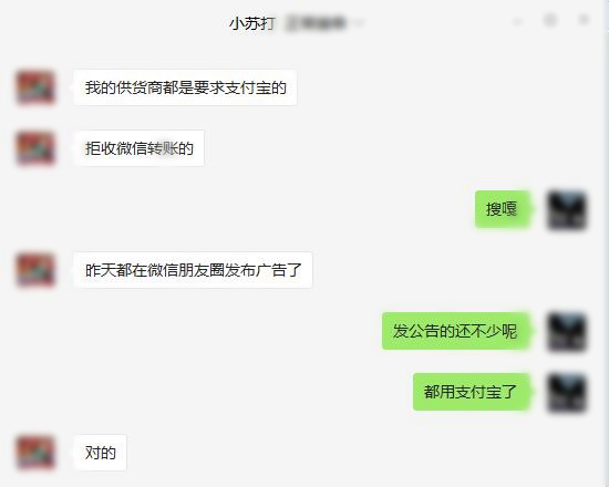 除了朋友圈里的怨聲載道,小編從其它微商朋友中也了解到,幾乎全部的供貨、發貨商都已在29日提前發布公告,稱不再接受微信轉賬,改用支付寶。“因為供貨幾乎都是萬元以上的交易。”之前的時候,即使微信轉賬2萬以上才收費,大家也都優先微信,用完2萬額度以后再移步到支付寶。今后的話,“直接就全部用支付寶交易了。微信徹底免了。”做化妝品代購的小蘇說。