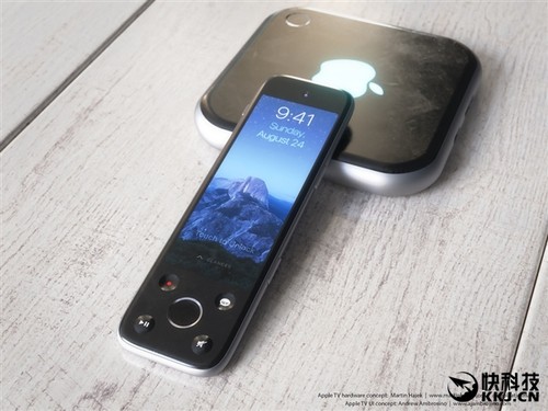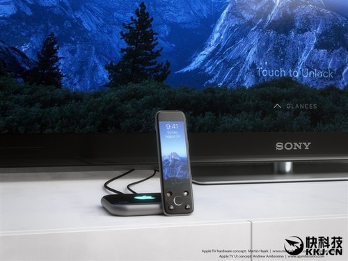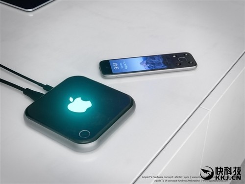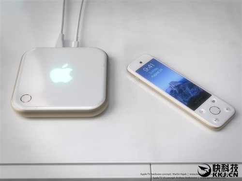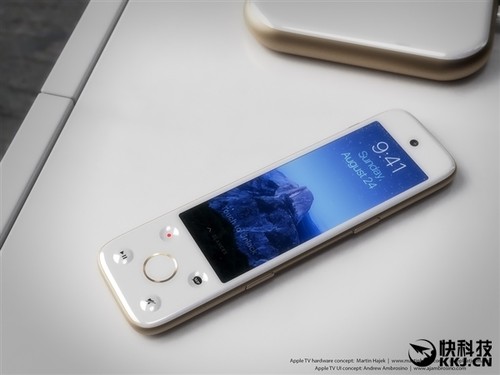 這組概念AppleTV采用了類似iPhone6s的設計元素,比如機身主體以及遙控器的邊緣過渡。機身正面是非常顯眼的蘋果Logo,左下角還采用了類似于iPhone6sTouchID的電源開關鍵。